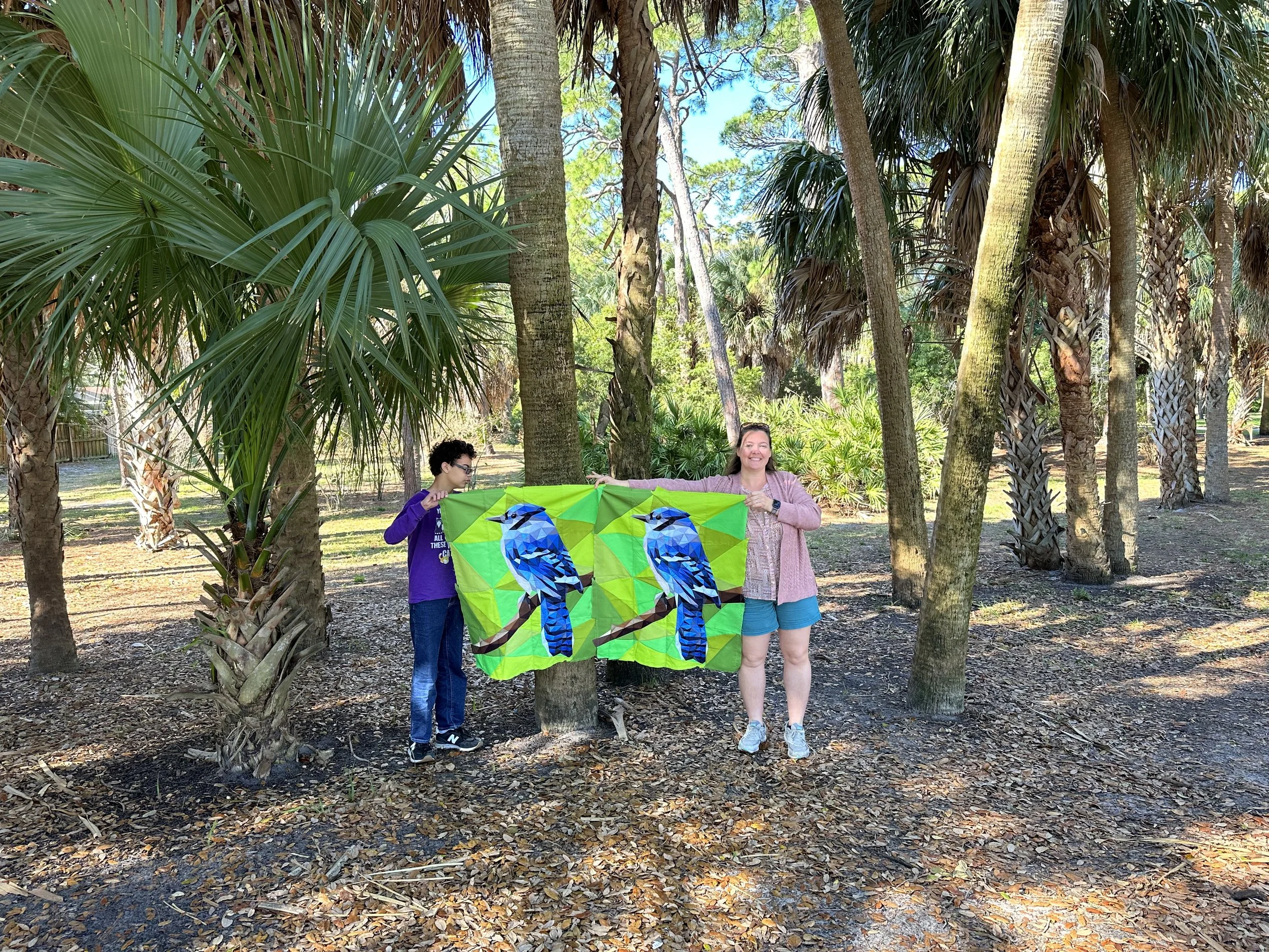 Even though my day job involves sewing, my hobby is also… sewing. So when we plan a road trip, I plan which projects to bring for the car, and also for the final destination. I bring my sewing machine with me everywhere! On our way to Florida last week, I was able to get a lot of cutting done in the car, then I finished up my two BJ the Blue Jay quilts in the AirBNB!